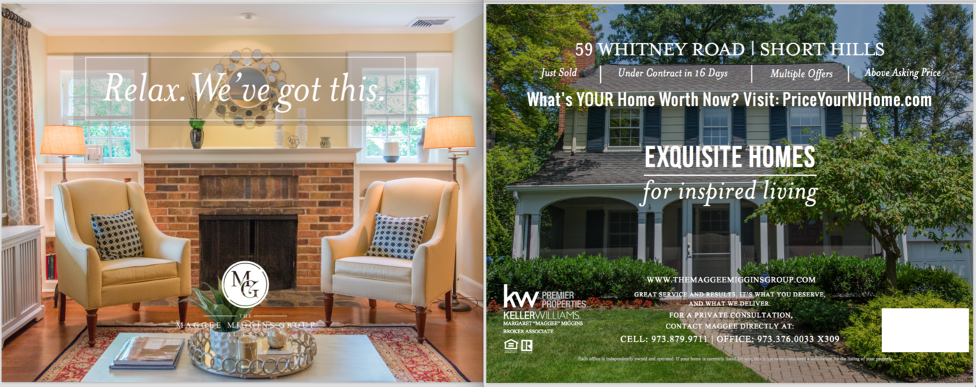 The Maggee Miggins Group, a luxury real estate firm in New Jersey, wanted to attract both buyers and sellers with postcards spotlighting some of their most stunning homes. To promote their outside-the-box thinking, they needed catchy lines relating to each featured room. Here are just two from the attention-grabbing series.