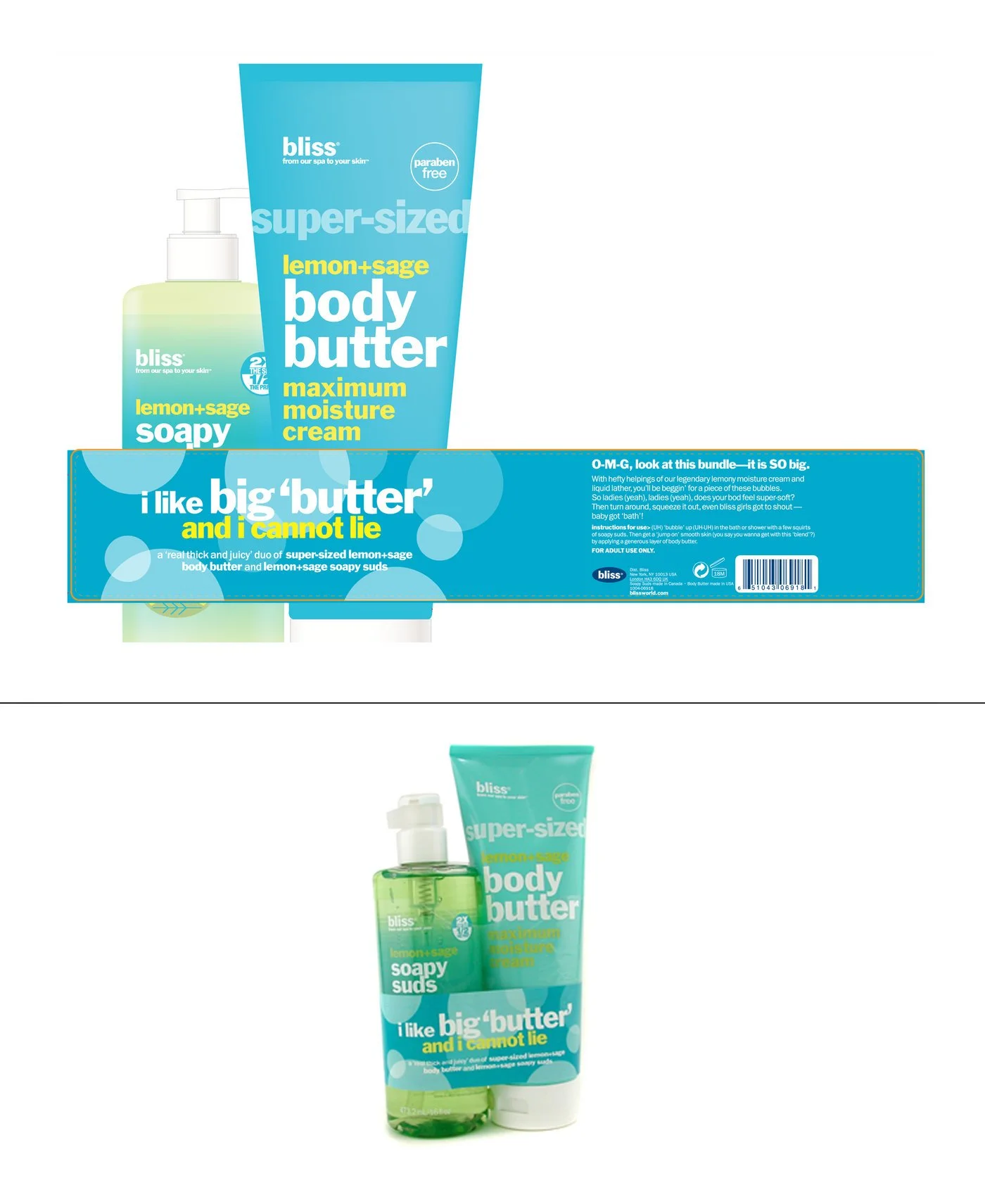 This limited edition duo paired a Bliss shower gel with a super-sized tube of their body butter. The attention-grabbing name and supporting copy on the belly band promoted the jumbo size and made a big impression by riffing on a song everyone knows.