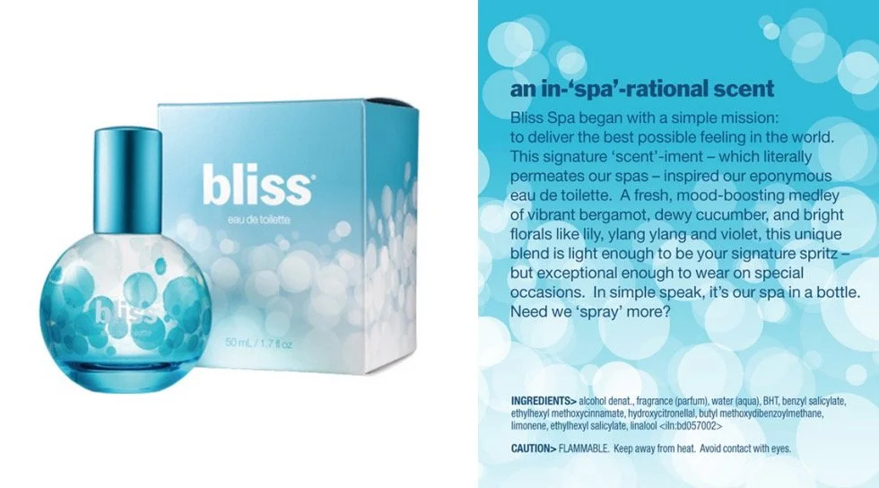 The box copy for Bliss Eau de Toilette, their very first fine fragrance, romanced spa lovers while remaining true to the brand's roots.